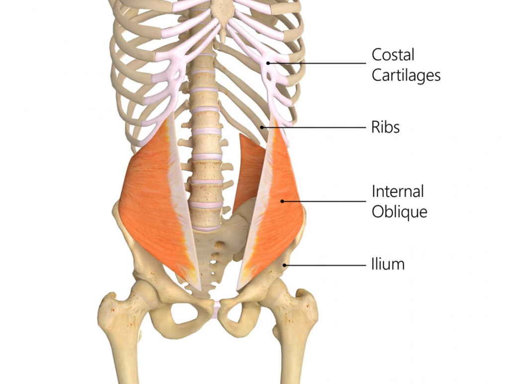 This is a broad, sheet-like muscle, located deep to the external oblique. Smaller than the external oblique, fibers of this muscle slope upwards and forwards. It can be described as running superiorly and medially (think of left hand on heart).