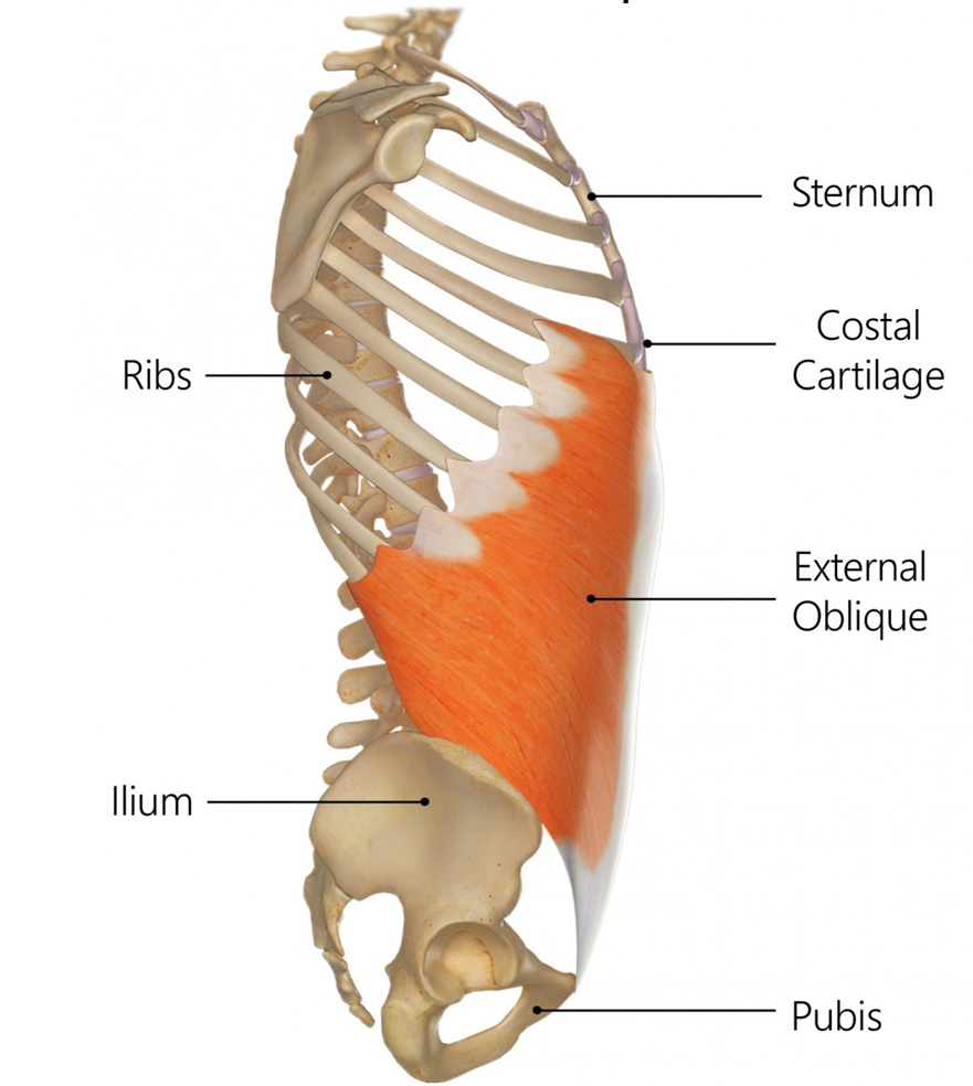 This broad, flat muscle covers much of the lateral trunk. Its fibers run downwards and forwards (toward the midline) It can be described as running inferiorly and medially (think of hands in your pockets).