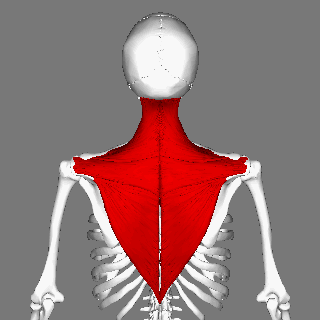 This is a large, flat, triangular sheet of muscle. It covers the posterior neck region and the upper region of the back. It attaches the axial skeleton to the upper appendicular skeleton. Can you see this on the diagram? Looking at the diagram, why do you think it’s named “trapezius”?